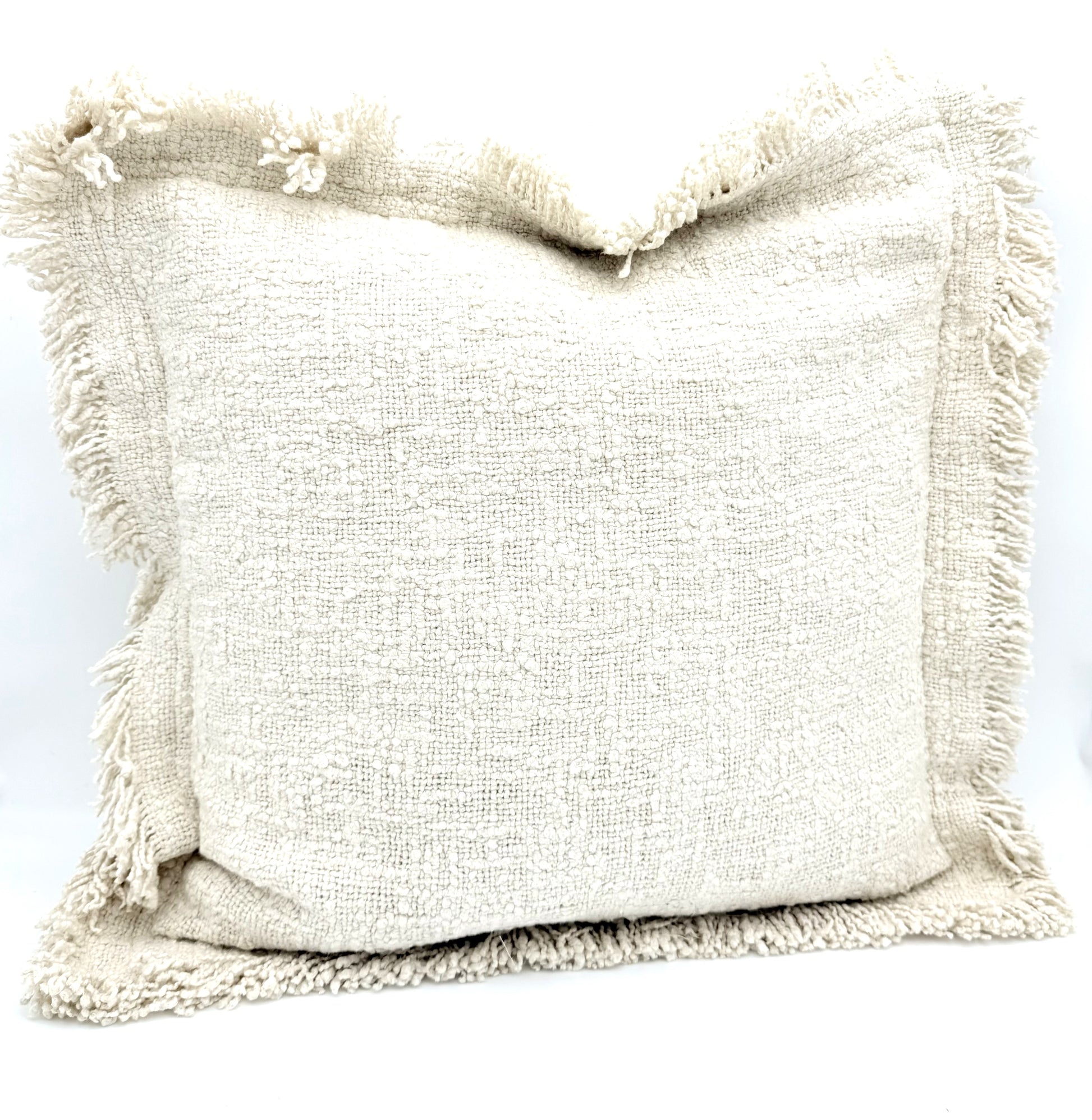 20" Square woven cotton boucle pillow with fringe and flanged edge