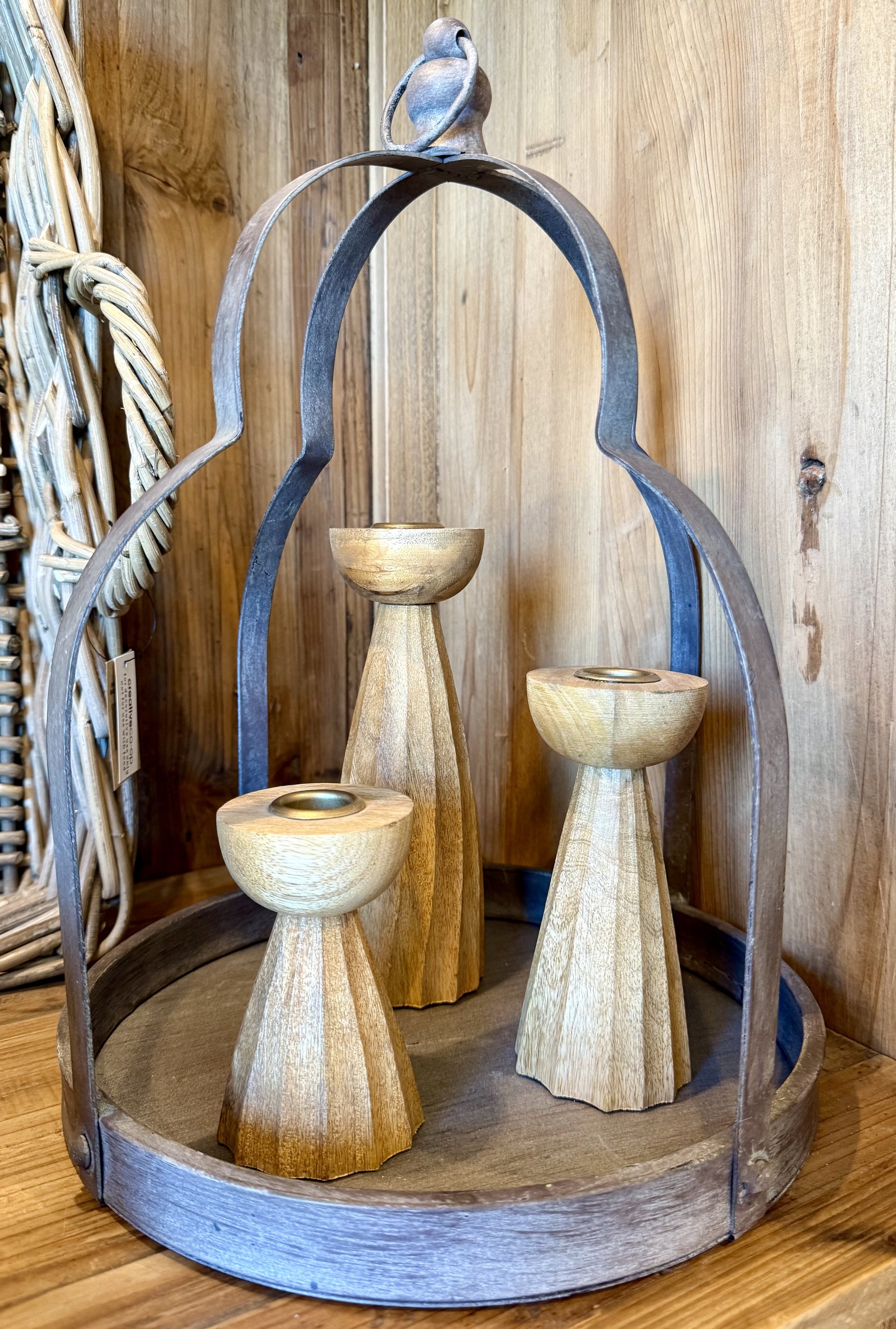 Carved Mango Wood Pleated Taper Holders, Set of 3