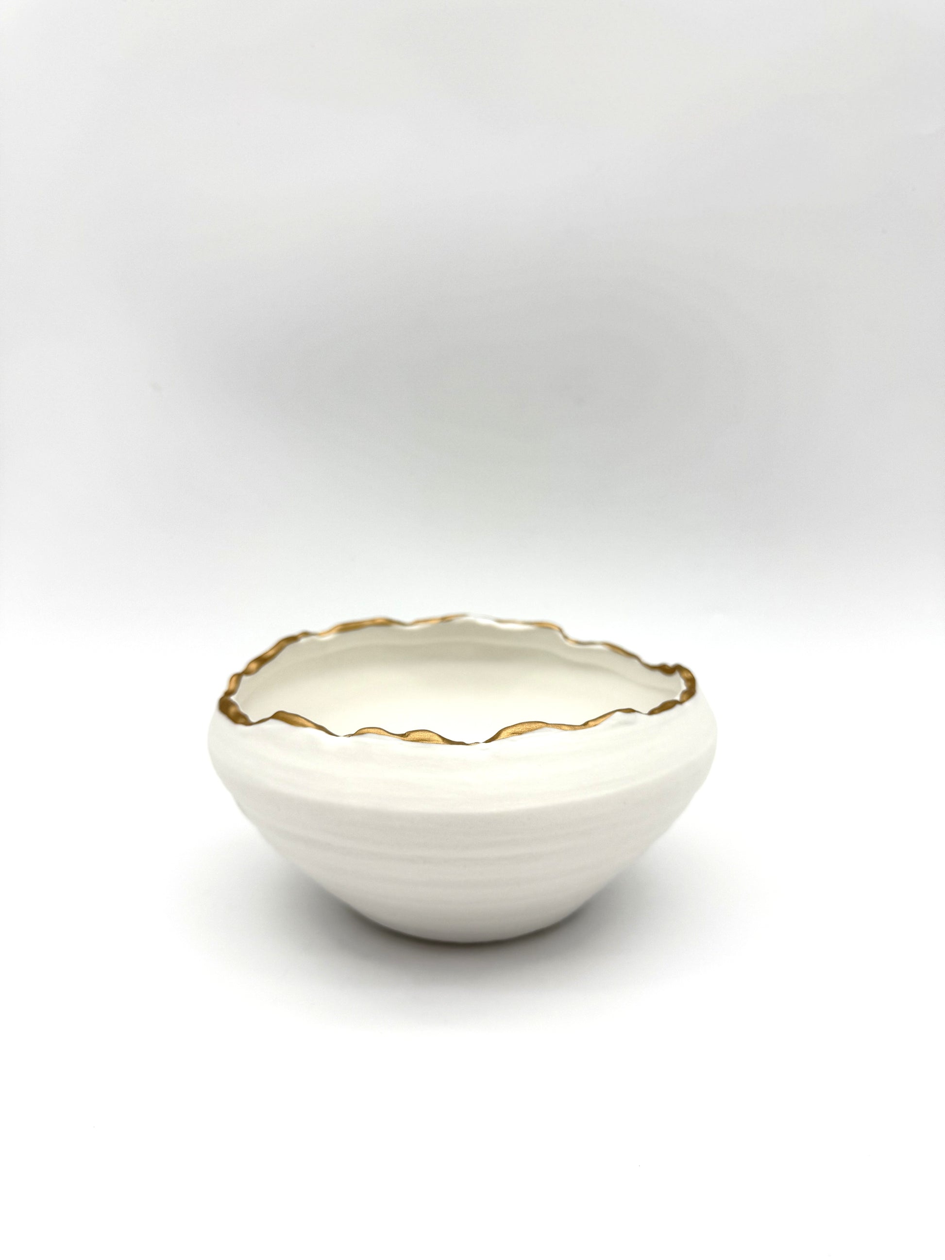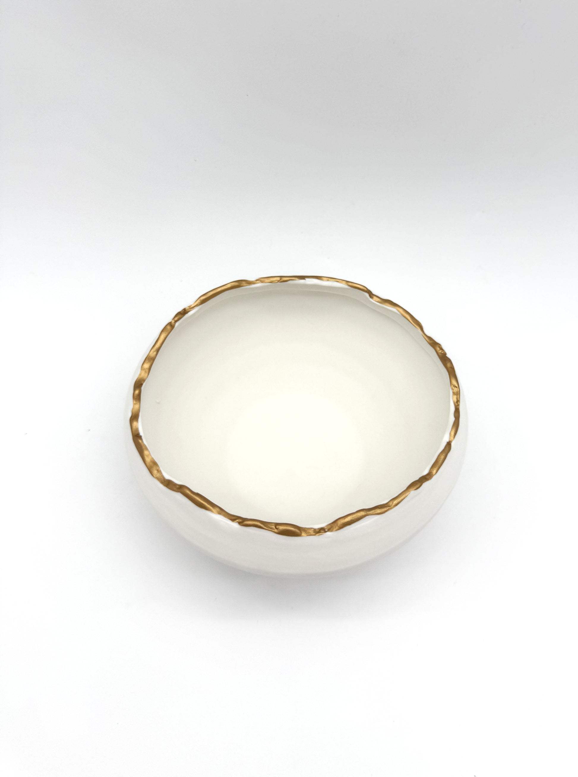 Our Gilded Organic collection includes artisan crafted white porcelain vessels with a glistening golden rim. The formal finishes modernize these organic containers that showcase ridges along their exterior from their thrown clay formation and beautifully imperfect edges along the opening, which are celebrated with gilded detail. This expertly formed and hand painted 6” bowl narrows at its base. This contemporary piece is an exquisite shelf accessory, stylish catch-all bowl on a coffee table or counter, or used as a planter for an orchid or other tall plant that will allow its gold accent to shine.
