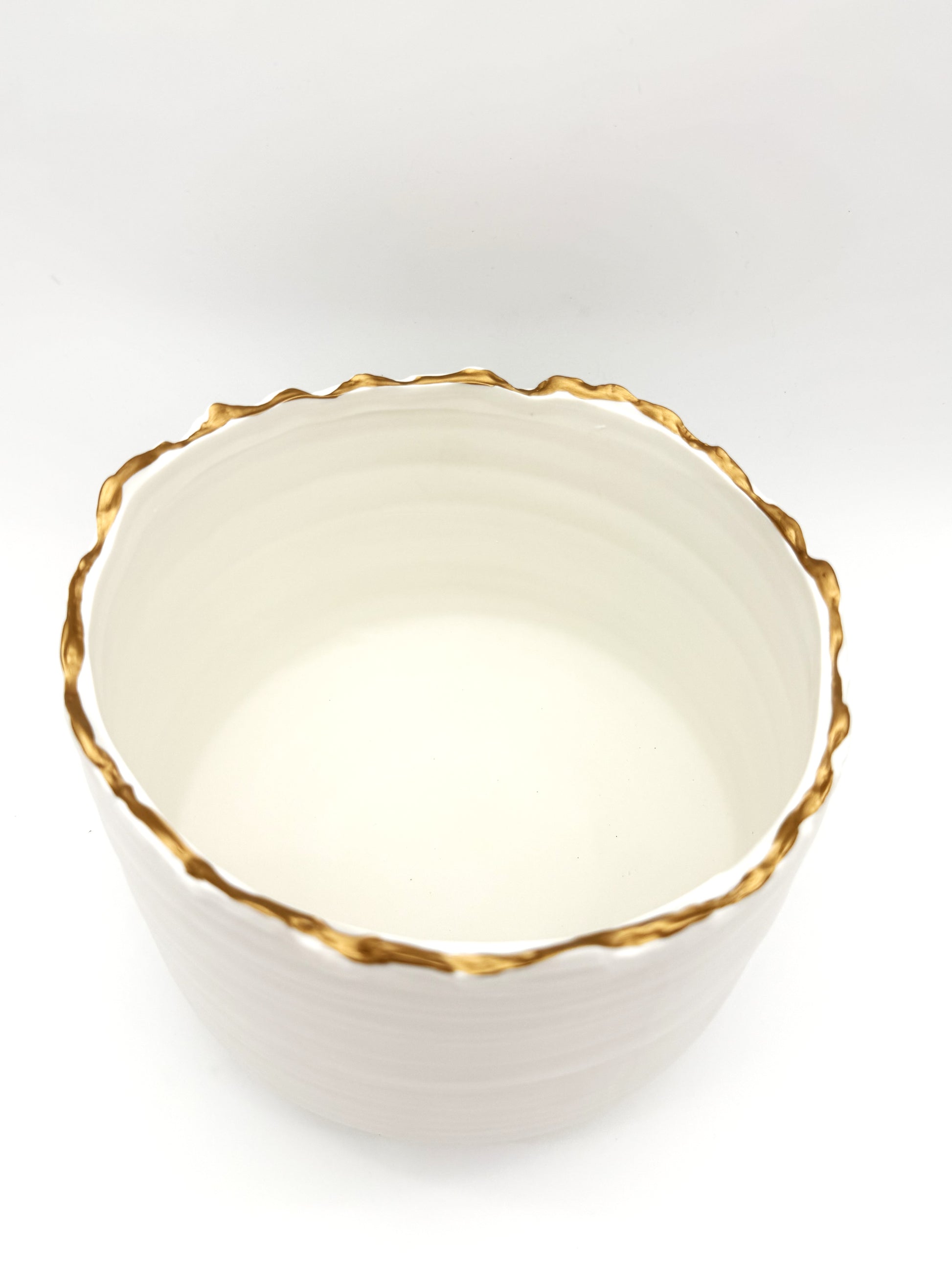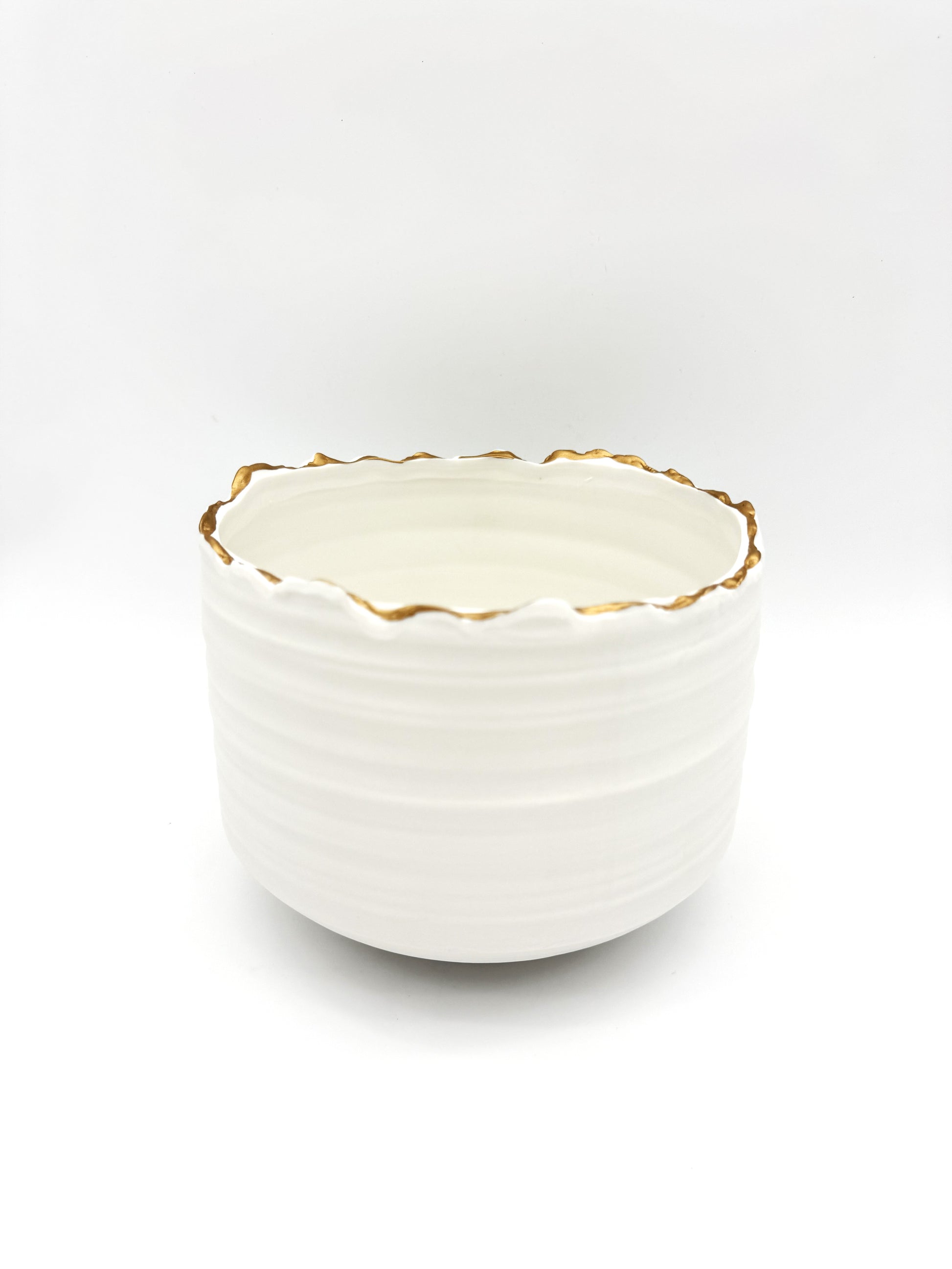 Our Gilded Organic collection includes artisan crafted white porcelain vessels with a glistening golden rim. The formal finishes modernize these organic containers that showcase ridges along their exterior from their thrown clay formation and beautifully imperfect edges along the opening, which are celebrated with gilded detail. This expertly formed and hand painted 5” pot narrows at its base. This contemporary piece is an exquisite shelf accessory, a perfect tulip vase, or planter for a small orchid or flowering annual that will allow its gold accent to shine.