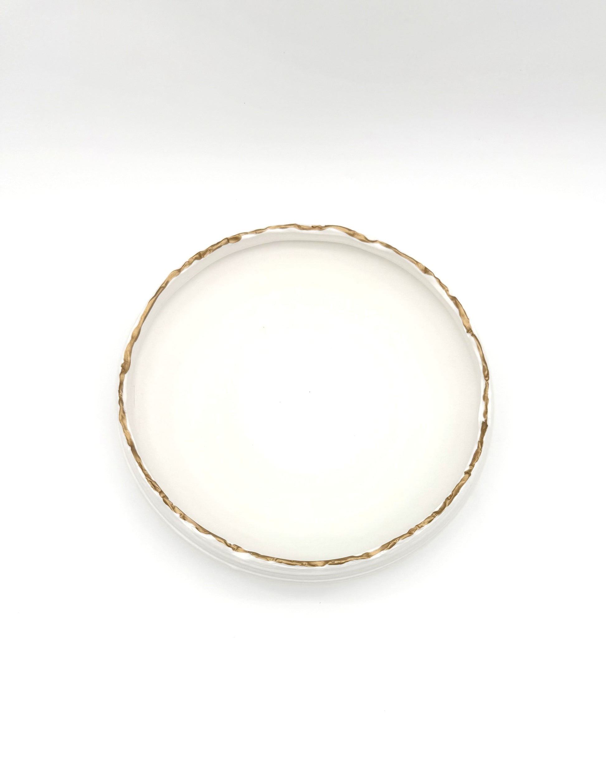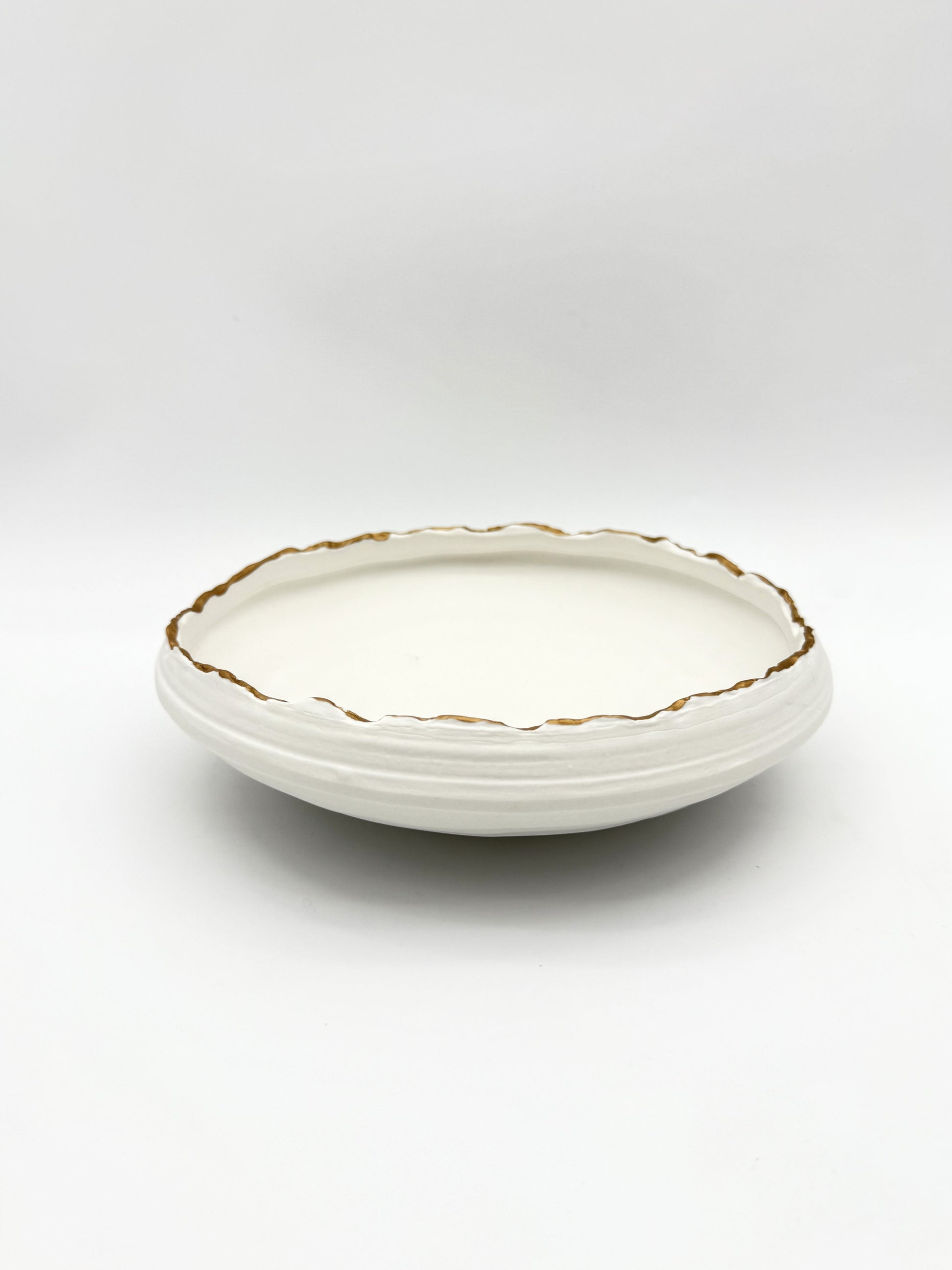 Our Gilded Organic collection includes artisan crafted white porcelain vessels with a glistening golden rim. The formal finishes modernize these organic containers that showcase ridges along their exterior from their thrown clay formation and beautifully imperfect edges along the opening, which are celebrated with gilded detail. This expertly formed and hand painted 9.25” bowl is wide and shallow. This contemporary piece is an exquisite shelf accessory, stylish catch-all bowl on a coffee table or counter, or a planter for a succulent garden that will allow its gold accent to shine.