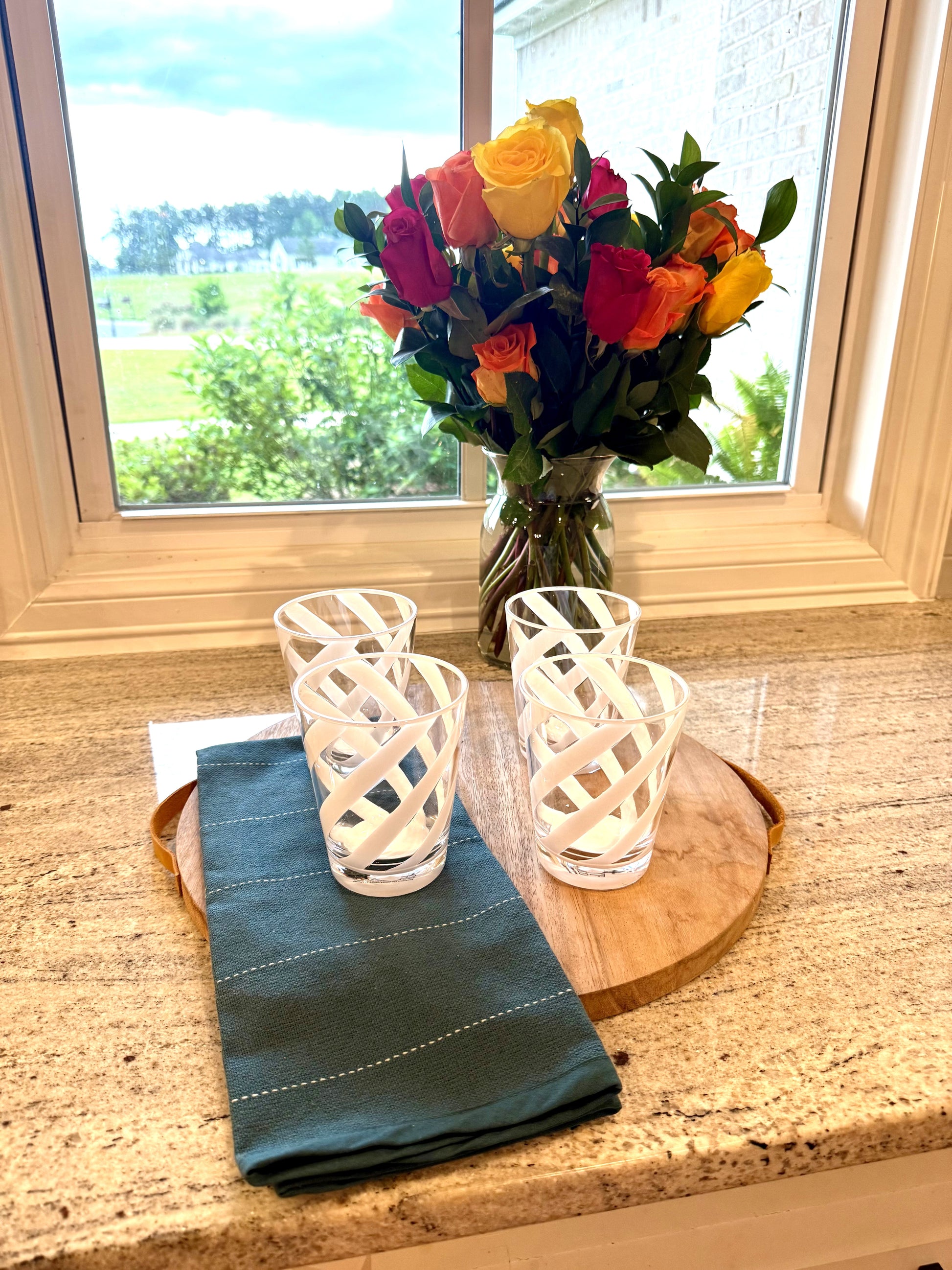 Set of 4 low ball tumblers is the perfect addition to entertain guests or use daily on your family dinner table. The transparency allows for liquids to be visible while featuring a white interwoven design.