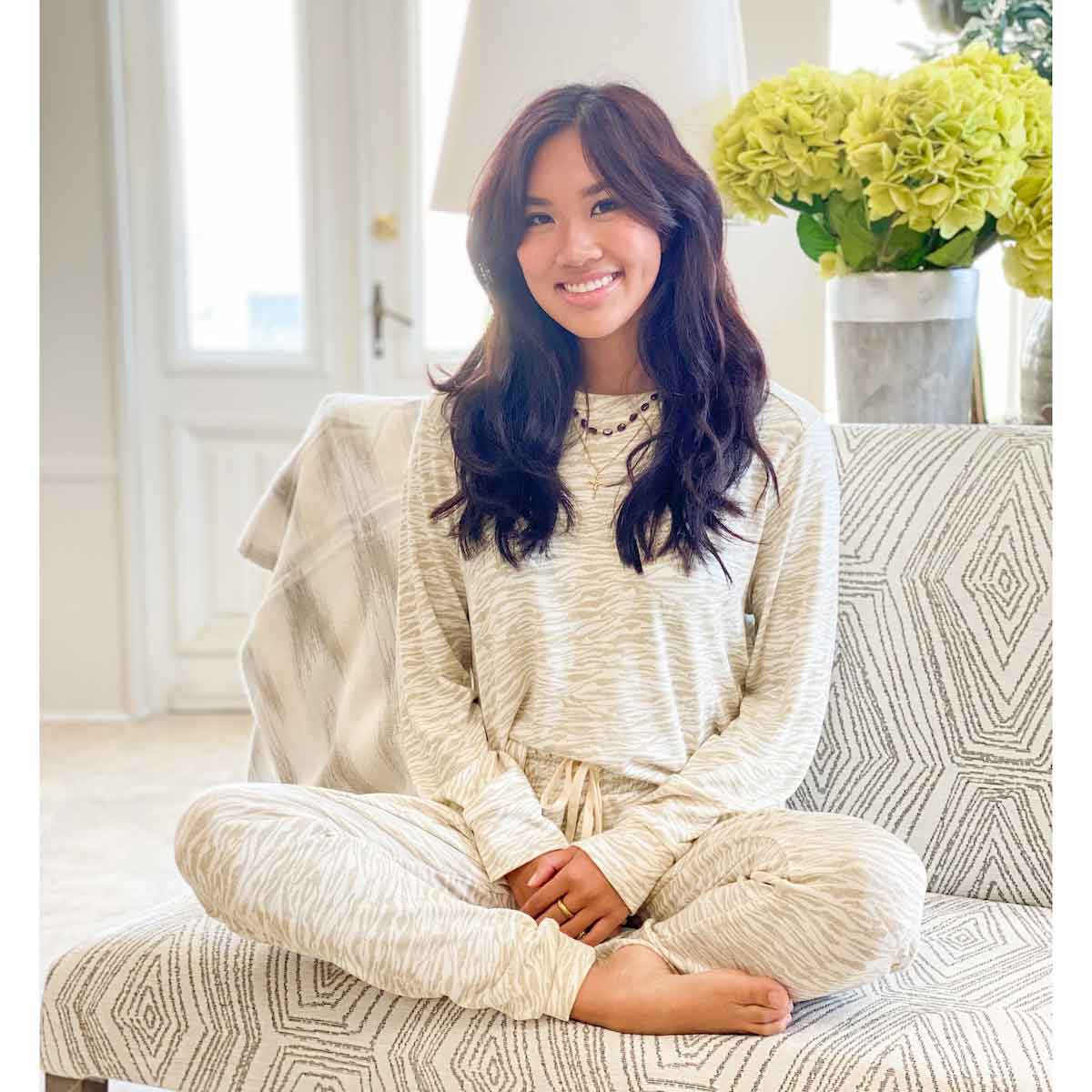 Tone on tone white and tan tiger stripes cover our most comfy effortless joggers with pockets and waist tie.